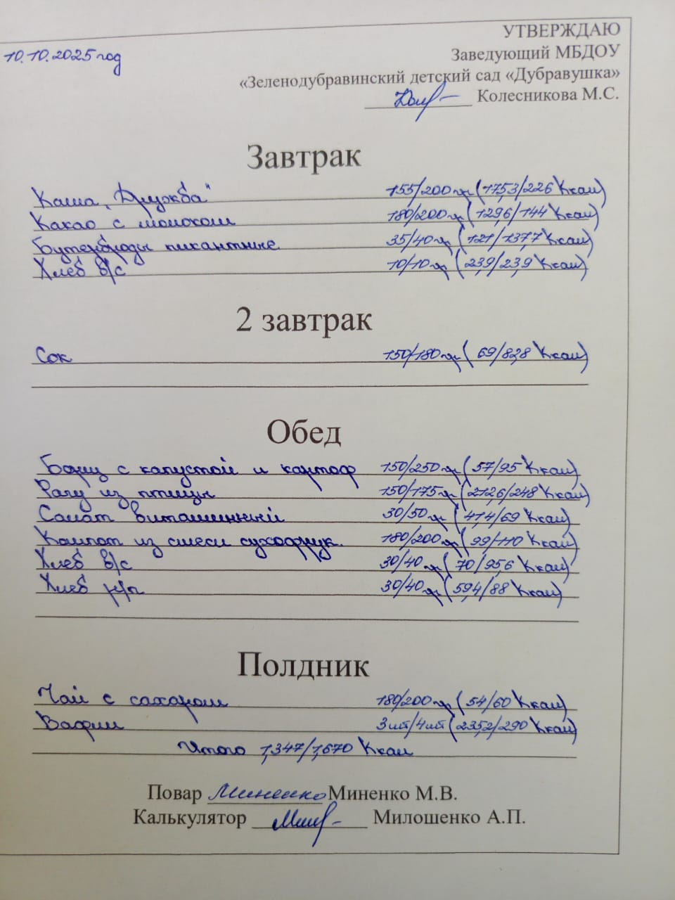 Меню филиала "Зеленодубравинский детский сад "Дубравушка" на 10.10.2025 г.